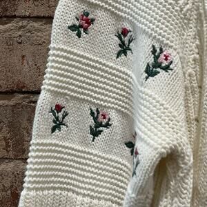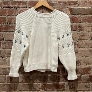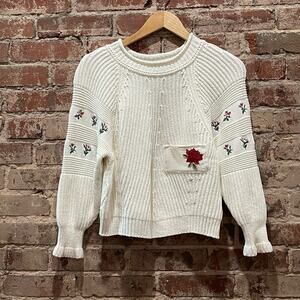 Knitted cropped sweater embellished with floral embroidery at raglan sleeves. Stock photo varies slightly from actual sweater.