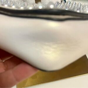 See photos for signs of wear on button snap and wrinkling in corners and mild wrinkling on handle. Bag is more of a cream color with iridescence. Some spikes may be capped due to wear, but none are missing. All sales final. Priced to sell.