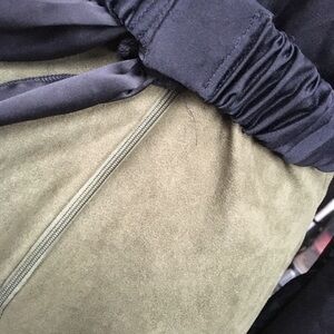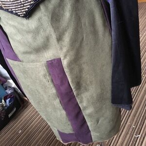 A green and purple faux suede color block design skirt with fitted waist. Zips at center back and has hook and eye closure. Made from a medium weight polyester fabric with a suede texture. Looks great with stockings and knee high boots. Size 6