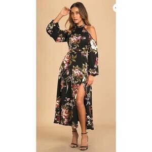 Lulus Dress Women's SZ M Black Floral Cold Shoulder Long Sleeve Maxi Slit Party