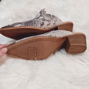 Dingo Knockout Natural Suede Leather Slip On Mules with a striking western snakeskin design and pointed snip toe. Gray/white. Size 7 medium. New with tag (do note a couple of tiny chipped spots to insole as shown in photos). Perfect for everyday wear or a night out.
