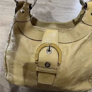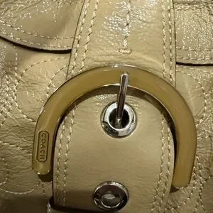 Chic Coach shoulder bag in beige leather. Features textured design and silver hardware. Ideal for stylish outings.