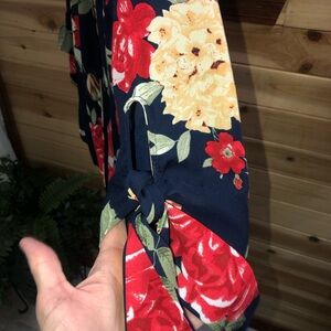 Chic floral blouse with a wrap design. Features red and yellow flowers on a navy base. Ideal for versatile styling.