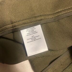 This Veronica Beard Miranda Pant in olive green is crafted from a luxurious blend of rayon and acetate, featuring a satin crepe fabric with a solid pattern. The pants are size 4 with a 30-inch waist and have a high-rise fit with a straight leg and ankle length. They are designed with a zip closure, flat front, and convenient pockets, making them suitable for both casual and business occasions. The pants offer comfort and easy care, making them ideal for year-round wear.