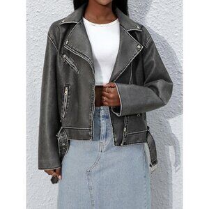 Women's Grey Faux Leather Lapel Collar Zip Up Long Sleeve Short Coat Jacket