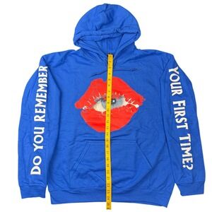 Bright blue pullover hoodie with front lips graphic and full European tour cities printed on the back and sleeves. Only taken out of packaging for photos.