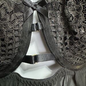 Beautiful baby doll top from Lane Bryant Cacique in a size 38DDD. Shimmery lace detail on cups and sheer black material on skirt. Adjustable straps going down the back and two straps crossing on top of bust area that can be removed. Cups have underwire and three hook and eye closure on back. New with tags.