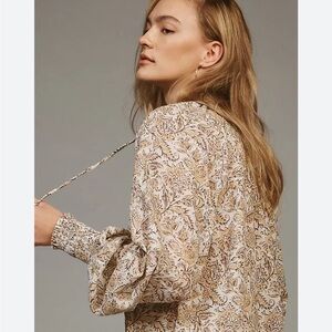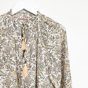 Anthropologie botanical print peasant blouse in white/peach/gray colorway, 100% Cotton, v-neck with tassel ties, ruffle collar, smocked elastic cuffs. Excellent pre-owned condition. Offers welcome!