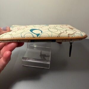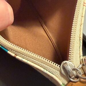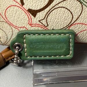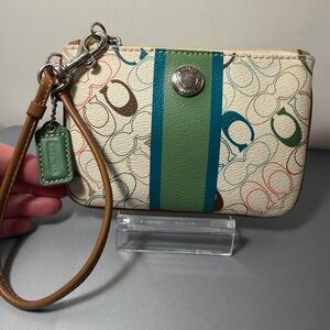 EUC vintage Coach Chelsea Heritage Stripe wristlet in cream, green, and tan with a signature canvas print and leather strap. clean in and out