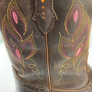 Women's brown leather Justin cowboy boots. These stylish boots feature intricate pink and yellow stitching details on the shaft and a classic wingtip toe overlay. The durable construction and comfortable fit make them perfect for a day on the ranch or a night out in town.