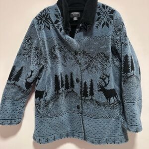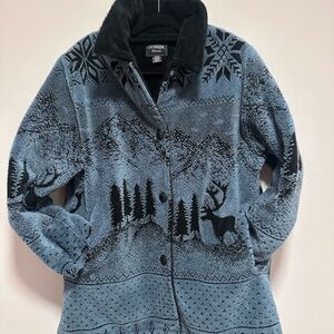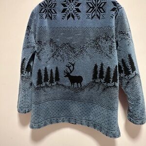 Warm fleece jacket with mountain and deer design. Ideal for outdoor wear.