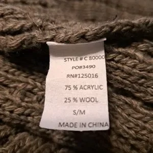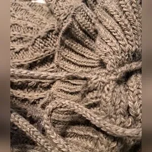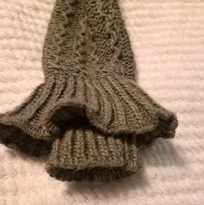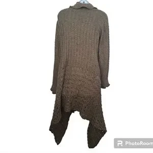 Greenish grey long open tie front cardigan by S Line Black Label. (I see more of a gray color. and my neighbor sees more green.) Double ruffle neckline and ruffled sleeves. One of the strings on the tie front is still attached but could use reinforcing. Dress up or down. Acrylic and wool. See pics for measurements. Good used condition.