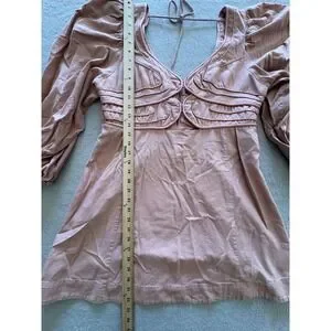 FARM Rio for Anthropologie rose pink mini dress with puff sleeves and a deep V-neckline. This charming dress features a cinched waist with decorative piping and ties at the back of the neck. The playful silhouette and vibrant hue make it perfect for brunch with friends or a stylish vacation look.