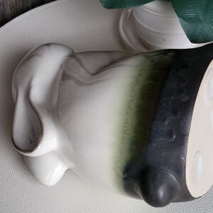Charming ceramic bunny figurine. Features a sleek white body with a black accent. Perfect for home decor.