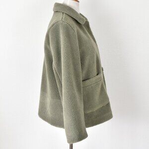 Long sleeve. Snap button front. Open front pockets. Thick, cozy material. Fully lined. Fleece/faux fur texture. Leather (not sure if real leather) interior trim.