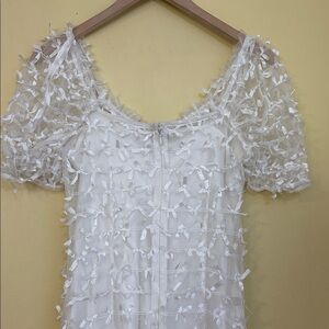 Turn heads in this ultra-feminine white mesh mini dress covered in delicate 3D ribbon bows. Features sheer puff sleeves, a soft sweetheart neckline, and a flattering A-line skirt that moves beautifully.
