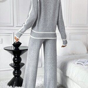 Grey casual loose contrast color knit sweater set offers a relaxed silhouette perfect for late‑fall weather. A stand collar frames the neckline while long raglan sleeves add effortless movement. The matching long pants are unlined and flow freely, delivering comfort without bulk. Crafted in a soft knit, the set combines a regular‑length top with a loose fit, making it easy to layer over tees or under jackets for a versatile, everyday look.