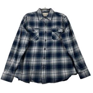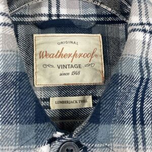 Weatherproof Vintage button-up shirt is perfect for any casual or workwear. Features a collared neckline with a button-down style and long sleeves with button cuffs, breast pockets and side pockets in grey/blue plaid flannel pattern. Made of cotton flannel and is machine washable for easy care. It is a regular fit and is size Large. The shirt also includes pockets and the Weatherproof brand logo as accents.