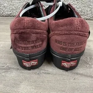 Elevate your sneaker game with these limited edition VANS Old Skool Stackform Shoes in collaboration with Disney. These shoes feature an adjustable lace-up closure and a low top shoe shaft style, making them perfect for both activewear and casual occasions. The wine-colored suede upper material is accented with the VANS logo and the iconic Disney Poison Apple design, making them a must-have for any Disney fan.