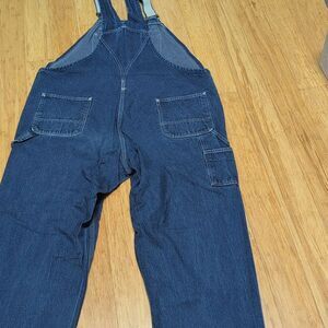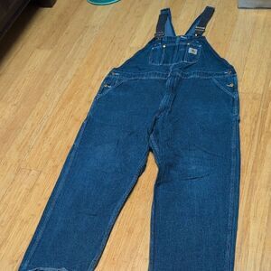 Rugged and comfortable denim overalls. Ideal for work or casual outings. Features adjustable straps and multiple pockets and metal button detail.