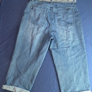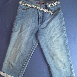 Stylish blue denim capris featuring a unique patterned belt. Perfect for casual wear.