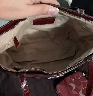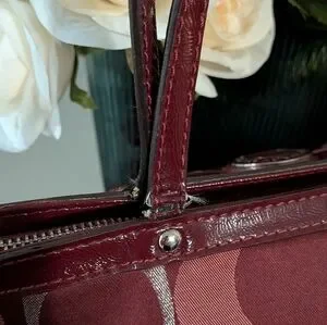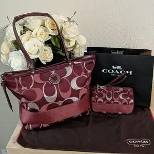 Don't miss this rare matching Coach SET! Includes Coach Signature Jacquard Wine Red Metallic Stripe with Silver Accent "C" Pattern shoulder tote bag trimmed in patent leather, and matched wristlet wallet. It DOES come with the original Coach dust bag. It *DOES NOT* come with the Coach Cherry Charm (styling prop only). The canvas on both the bag and wristlet is in perfect condition with no flaws inside either. The patent trim on both pieces is mostly clean except the base of the tote's handles where there is some wear as shown. There are no odors, etc. Wristlet is 6"x4" and Bag is 14" (at top) x 9" x 5". Ships immediately from smoke-free home with care by 5 Star Seller. (I also have a red metallic pebble leather Mickie bucket bag also listed if you are interested)