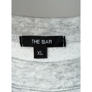 This is a pre-owned THE BAR Varsity Sweatshirt in light heather grey with "THE BAR" in lemon yellow lettering across the chest. The sweatshirt features a crew neck, long sleeves with ribbed cuffs, and a ribbed hem. The fabric appears to be a cotton-blend material. The visible tag indicates size XL. The garment shows light signs of wear consistent with a pre-owned item, excellent condition