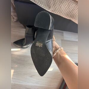 Step out in style with these chic black ankle boots featuring a sleek gold buckle. Perfect for any occasion.