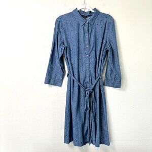 Talbots Polka Dot Denim Shirt Dress Women's Belted 3/4 Sleeve Knee Length