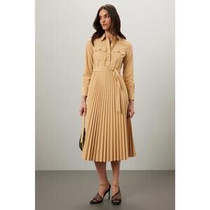 Fabric, beige color, and Kenza pleated shirt dress silhouette remain in good wearable condition.