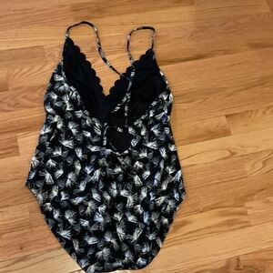 Elegant one-piece swimsuit with palm leaf design. Features a stylish cross back. NWOT has hygienic panty liner