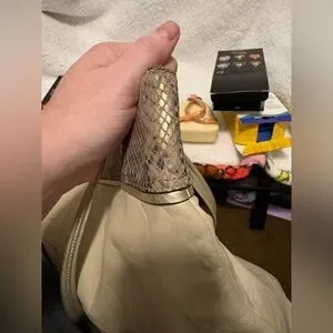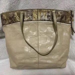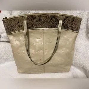 Coach Beige and Gold Tote Bag with Snake Skin Trim