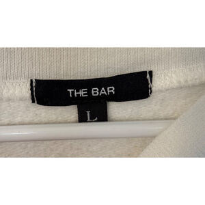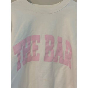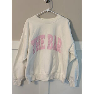 Pre-owned The Bar varsity sweatshirt in white and blush. Features an oversized boyfriend fit with drop-shoulder sleeves. The sweatshirt is made of 90% cotton and 10% polyester, imported and silk-screen printed in NYC. It displays 'THE BAR' in pink arched lettering across the chest. The size is L. There is a light and small discoloration on front of shirt. Great condition overall