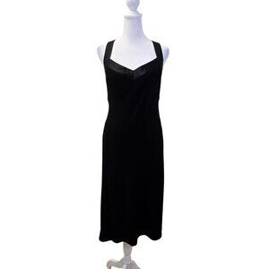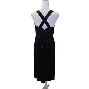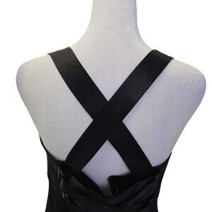 Gorgeous black cocktail dress that feels like a chiffon with silk trim detail. Criss-cross strap at the back. Side zipper closure and the back is a corset style, giving this dress just a little added extra. Pair with heels to complete the look.