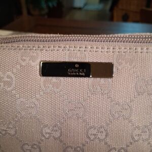 A light purple Gucci pouch featuring the signature GG monogram canvas, accented with a polished metal logo plaque and a top zipper closure. Stylish and compact, it’s perfect for carrying essentials with iconic Gucci elegance. This little purple Gucci pouch is super super cute. The bag looks great on both the inside and outside. The measurements are W 10.0 inches H 4.5 inches Depth is 3.25 inches. Please go check out the pictures to see for yourself. If you have any questions please let me know thanks.