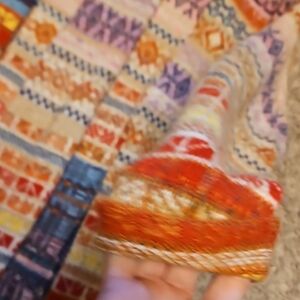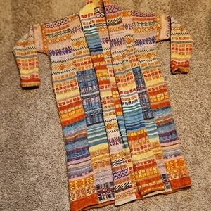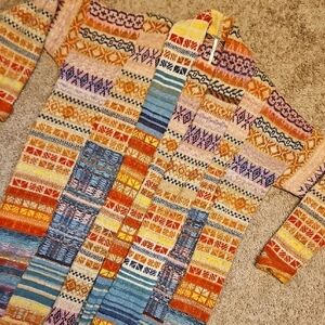 The "Met Your Match" cardigan is a maxi-length sweater coat known for its vibrant, multicolored patchwork design. The style features a mix of knit patterns, including stripes and Aztec-inspired motifs. It is made from a wool-blend material and is often described as a boho or statement piece.