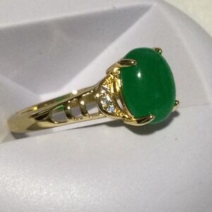 Make a vibrant statement with this eye-catching jade ring. This stunning piece features a smooth, oval cabochon of lush green jade, set in a decorative gold-tone setting with sparkling accents. The detailed band adds an extra touch of elegance to this timeless design. Slip it on to elevate any ensemble with a pop of color and sophistication. Perfect for adding a touch of glamor to a special night out, injecting personality into your everyday style, or as a thoughtful gift for someone special.