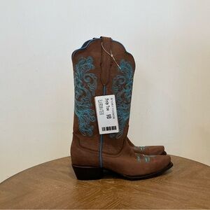 The Ferrini Women's Ella Floral Cross Western Boots offer a seamless blend of intricate design and robust craftsmanship, fitting perfectly into both laid-back and upscale western scenes.