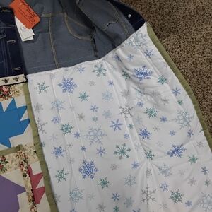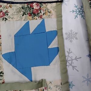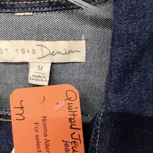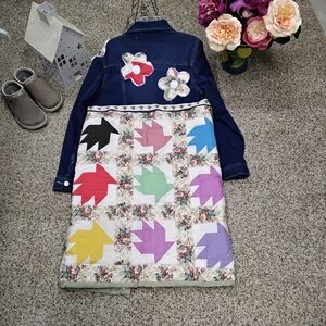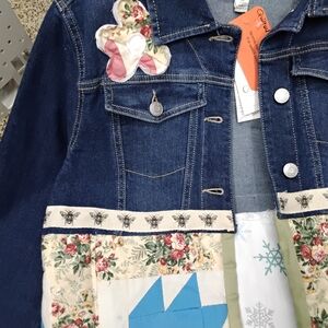 Elevate your style with this unique jean jacket featuring a quilted floral patchwork design and vibrant multicolor leaf accents. Perfect for a bold fashion statement. Ptp 19.5" length 39" sleeve 24".