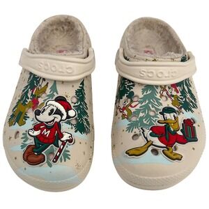 Crocs lined clogs showcasing a festive Disney holiday theme with Mickey Mouse and Donald Duck characters. These cream-colored clogs feature a cozy sherpa lining for warmth and winter-themed graphics including trees and snowflakes. The iconic Crocs design ensures comfort and durability with a pivoting heel strap for a secure fit.