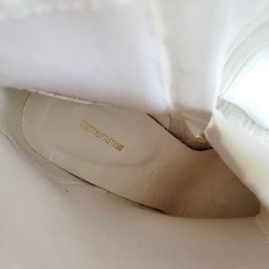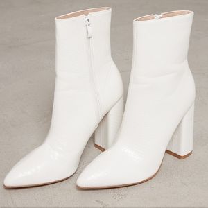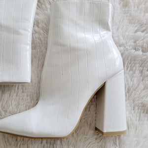 PrettyLittleThing White Faux Snakeskin Print Ankle Boots. Size 7. Excellent condition. Very gently worn. Snakeskin Embossed print. Chunky Heel. 4" heel. Zipper closure on the inside. Orig. $68.