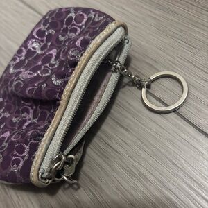 Elegant Coach coin purse. Features purple fabric with silver accents. Zipper closure with charm detail.