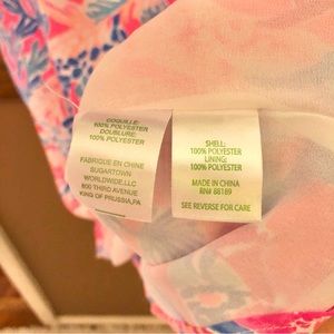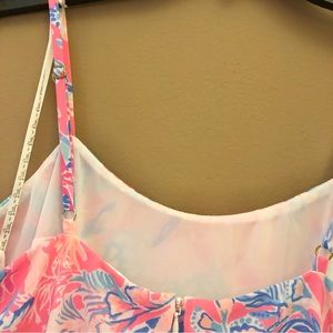 Lilly Pulitzer Lexi Dress Aquadesiac Light Pascha Pink XS. 100% polyester. Flounce ruffle top. adjustable straps. Coral print. Zipper on back. Good preowned condition, mark on inside of lining.