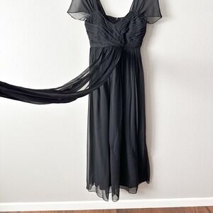 Delicate and lightweight black 100% silk chiffon gown. Cap sleeves, empire waist, hidden back zip closure, lined.