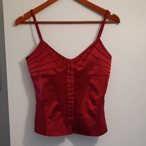 Chic red satin camisole with delicate straps. Perfect for a stylish look. Hook and eye front; lace-up back adjustable. Lots of stretch.