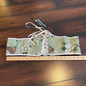 Keywords: brocade corset, butterfly print, floral print, waist cincher, gothic, romantic, lace up, bustier, cinched waist, statement piece, festival wear, evening wear