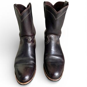 Originally designed to help rodeo cowboys rope calves in competition, roper boots are known for their easy to wear, low heels. Made of pull up leather, perfect for everything from calf roping, bull riding and bar hopping. Clean and simple, these boots are no-frills, just like those rodeo cowboys. Paid $398 brand new. These have been broken in but kept in pristine condition. Please see the wear on the heels (last two pictures).