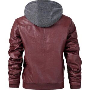 Mens Wine Red 1 Faux Leather Removable Hood Motorcycle Casual Warm Winter Jacket