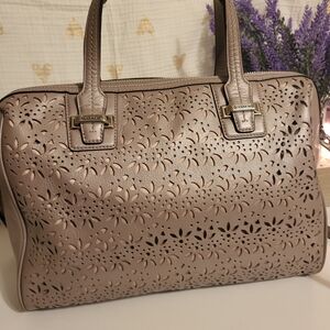 Chic Coach satchel in brown. Features floral charm and intricate cutout design. Perfect for any outfit.