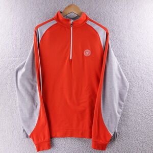 Hit the links in comfort and style with this vibrant orange and gray FootJoy golf pullover. Designed for the discerning golfer, this 1/4 zip offers a sleek athletic fit and the signature FJ quality you expect. The contrasting gray sleeves provide a modern aesthetic, while the pullover design ensures easy layering for changing weather conditions on the course. Perfect for a brisk morning tee time or a casual round on a cool afternoon, this pullover will keep you looking and feeling your best.
